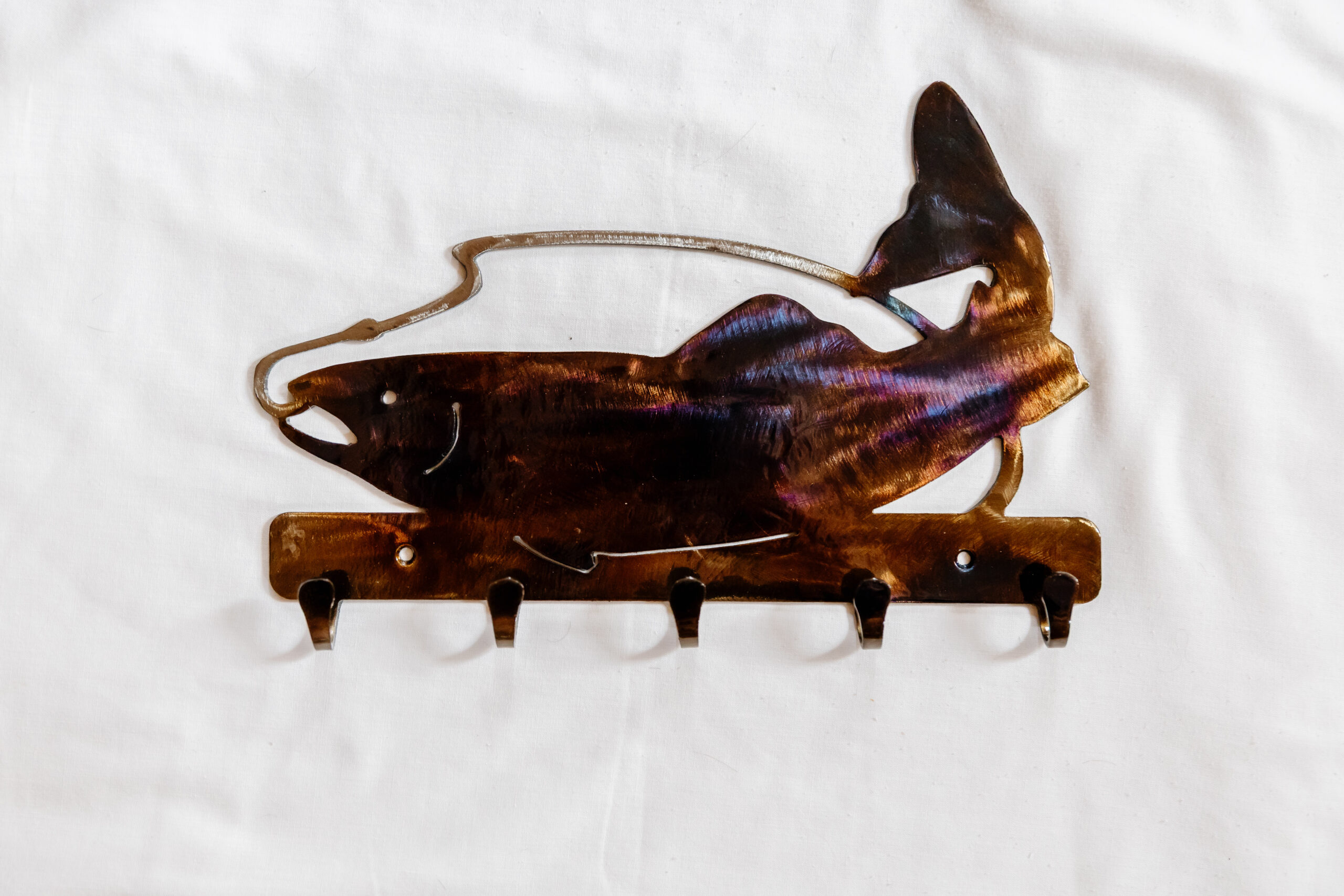 Handcrafted metal key hook with a Gliding Trout design. Keeps keys organized and adds fishing style. Quality material — Size: 12″ x 19″